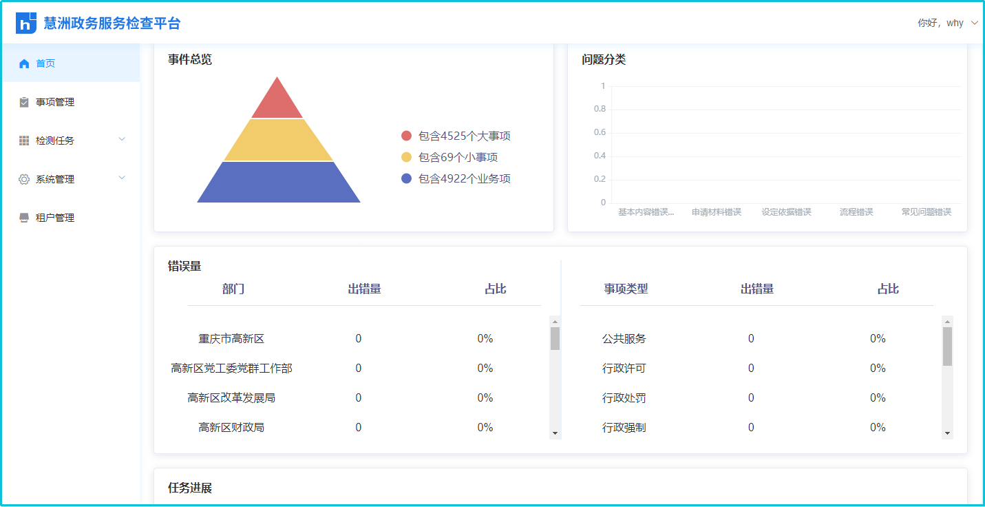 根據(jù)市場用戶功能需求的反饋與我公司對行業(yè)需求的深度理解,慧洲信息政務(wù)服務(wù)檢查平臺(tái)設(shè)計(jì)了包括事項(xiàng)管理、檢測管理、批次管理、檢測詳情、租戶管理、報(bào)表導(dǎo)出、系統(tǒng)管理等功能的智能化檢查服務(wù)平臺(tái)。詳細(xì)功能介紹如下: