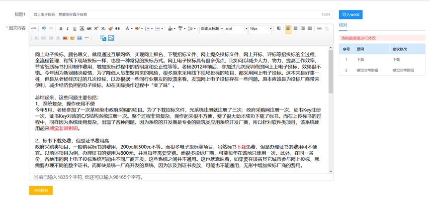 用戶可以拷貝需要校對的內(nèi)容,或者通過手工錄入需要校對的內(nèi)容到圖文編輯器中,也可以直接導(dǎo)入Word文件由系統(tǒng)自動提取正文內(nèi)容,在線對內(nèi)容進(jìn)行校對。當(dāng)內(nèi)容中存在錯別字或敏感詞時,系統(tǒng)會進(jìn)行提醒,并對存在的疑似錯誤采用紅色字體進(jìn)行標(biāo)記,便于用戶快速進(jìn)行定位、修改。