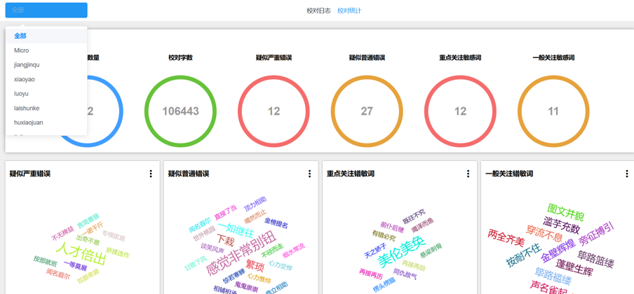 系統(tǒng)自動對校對過程中發(fā)現(xiàn)的疑似錯別字、敏感詞,按照出現(xiàn)頻次高低,通過熱點圖進(jìn)行統(tǒng)計排列,對出現(xiàn)次數(shù)多的詞語進(jìn)行預(yù)警、告知。對于普通用戶,可以查看本人的內(nèi)容校對統(tǒng)計數(shù)據(jù),管理人員可以分別查看某個用戶、全部用戶校對過程中出現(xiàn)的錯別字、敏感詞統(tǒng)計數(shù)據(jù),并按照重要程度進(jìn)行分類。